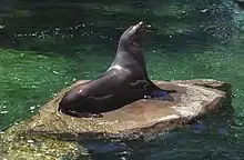 O leão-marinho é um animal pinípede caracterizado por orelhas na forma de abas externas, patas dianteiras longas, a capacidade de andar de quatro, cabelos curtos e grossos e um grande peito e barriga. Junto com os leões-marinhos, compreendem a família dos Otariídeos (nome científico: Otariidae), que contém seis espécies existentes e uma extinta (o leão-marinho-japonês) em cinco gêneros. Seu alcance se estende do subártico às águas tropicais do oceano global nos hemisférios norte e sul, com a notável exceção do oceano Atlântico setentrional.[1] Têm uma vida útil média de 20-30 anos. O macho de leão-marinho-da-califórnia pesa em média cerca de 300 quilos (660 libras) e tem cerca de 2,4 metros (8 pés) de comprimento, enquanto a leoa-marinha fêmea pesa 100 quilos (220 libras) e tem 1,8 metros (6 pés) de comprimento. O maior leão-marinho é o é o Leão-marinho-de-steller, que pode pesar 1 000 quilos (2 200 libras) e atingir o comprimento de 3,0 metros (10 pés). Consomem grandes quantidades de comida por vez e são conhecidos por comer cerca de 5–8% de seu peso corporal (cerca de 6,8–15,9 quilos (15–35 libras)) em uma única alimentação. Podem se mover cerca de 16 nós (30 quilômetros por hora) na água e, em sua velocidade, podem atingir uma velocidade de cerca de 30 nós (56 quilômetros por hora).[2] Três espécies, o leão-marinho-australiano (Arctocephalus pusillus), o leão-marinho-de-galápagos (Zalophus wollebaeki) e o leão-marinho-da-nova-zelândia (Phocarctos hookeri), estão listadas como ameaçadas de extinção.[3][4][5][6]