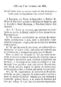 | “ | Art. 1º. Todos os escravos, que entrarem no território ou portos do Brasil, vindos de fora, ficam livres. Excetuam-se: 1º Os escravos matriculados no serviço de embarcações pertencentes a país, onde a escravidão é permitida, enquanto empregados no serviço das mesmas embarcações. 2º Os que fugirem do território, ou embarcação estrangeira, os quais serão entregues aos senhores que os reclamarem, e reexportados para fora do Brasil. | ” |