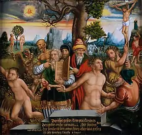 Uma formulação específica da distinção entre Lei e Evangelho foi proposta pela primeira vez na Igreja cristã por Martinho Lutero e estabelecida como a fundação da exegese bíblica evangélica luterana e foi exposta no artigo 4 da "Apologia da Confissão de Augsburgo" (1531): "Todas as Escrituras deveriam ser distribuídas nestes dois tópicos, a Lei e as promessas. Pois em alguns lugares elas apresentam a Lei e em outros, a promessa a respeito de Cristo, nomeadamente, seja quando [no Antigo Testamento] elas prometem que Cristo virá e oferece, em Seu nome, a remissão dos pecados, a justificação e a vida eterna, seja quando, no Evangelho [no Novo Testamento], o próprio Cristo, já presente, promete a remissão dos pecados, a justificação e a vida eterna".[2] A Fórmula de Concórdia, da mesma forma, afirmou esta distinção em seu artigo V, que diz: "Nós acreditamos, ensinamos e confessamos que a distinção entre a Lei e o Evangelho deve ser mantido na Igreja com grande diligência...".[3]