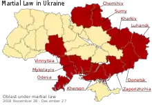 Em 26 de novembro de 2018, um período de lei marcial foi introduzido por decreto presidencial[10] em 10 oblasts da Ucrânia[11] a partir das 14h00 (hora local) por 30 dias, com o objetivo de fortalecer a defesa da Ucrânia no contexto da crescente tensão com a Rússia.[12][13] A imposição da lei aconteceu após o incidente do estreito de Querche.[14][15] A lei marcial foi encerrada após 30 dias.[16]