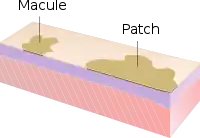 - Mancha: uma mancha é uma mácula igual ou maior que 5 mm de diâmetro, ou maior que 10mm (dependendo da definição de uma mácula). As manchas podem ter alguma alteração sutil da textura, áspera ou enrrugada, mas a própria lesão não é palpável. Pode ser causada pelo sol e por alterações hormonais.