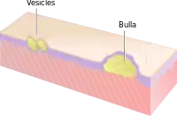 - Bolha: A bolha (ou bulla) é uma lesão arredondada ou oval que contém fluido seroso ou seropurulento, igual ou superior a 5 ou 10 mm, dependendo da definição de uma vesícula. Pode ser causada por pênfigo, penfigoide ou queimadura.