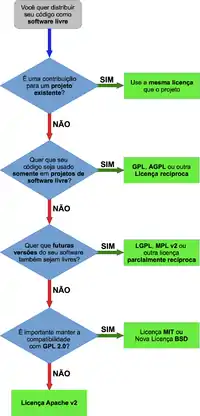 Sabino[30] apresenta ainda em seu trabalho um mecanismo para seleção de uma licença para os desenvolvedores que decidem compartilham seu código-fonte como software livre, reproduzido na figura.