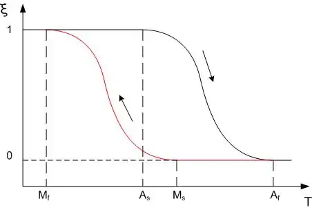 Nesta figura, ξ(T) representa a fração volumétrica de martensita. A diferença verificada entre o aquecimento e o resfriamento apresenta a histerese, indicando que energia mecânica é dissipada no processo. A forma da curva depende das propriedades do material da liga[10] como o endurecimento.[11]