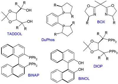 Desde então, tem sido preparados e testados muitos ligandos quirais, mas somente tem sido encontradas algumas classes de compostos com aplicação geral. Então, estes ligandos são denominados ligandos privilegiados.[4][5] Alguns membros importantes representados mais adiante são BINOL, BINAP, TADDOL, DIOP, BOX e DuPhos (um ligando fosfina), todos disponíveis como pares enantioméricos.