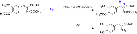 O primeiro de tais ligandos, a difosfina (DiPAMP) foi desenvolvido em 1968 por William S. Knowles da Companhia Monsanto, que ganhou o Prêmio Nobel de Química em 2001,[3] e finalmente o utilizou na produção industrial de L-DOPA.