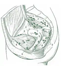 ![]() Glândulas iliopélvicas, vista lateral. (Hipogástrico rotulado no canto superior direito.) | |