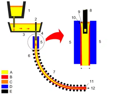 A. Aço Liquido B. Aço Solidificado C. Escória D. Água de refrigeração E. Material Refratário