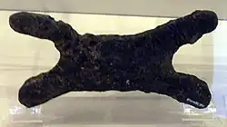 Na Idade do Bronze Recente, Chipre produziu numerosos suportes de bronze que mostravam um homem carregando um lingote couro de boi. Os suportes foram projetados para segurar vasos, e eles foram fundidos através do processo cera perdida.[47] Os lingotes mostram a forma familiar das quatro alças salientes, e o homem segura-os sobre os ombros. Estes suportes cipriotas foram exportados para Creta e Sardenha, e ambas as ilhas criaram suportes similares em oficinas locais de bronze.[48]