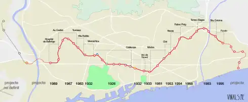 Após várias tentativas de se organizar uma empresa para projetar, construir e operar uma linha de metrô em Barcelona, as autoridades locais constituíram em 1920 o Ferrocarril Metropolitano de Barcelona (FMB). A empresa obtém do Reino da Espanha a autorização para realizar as obras apenas em 1922. Assim, as obras da Linha foram iniciadas em 5 de fevereiro de 1923. A abertura do primeiro trecho ocorreu em 10 de junho de 1926, com a inauguração das estações Santa Eulàlia, Mercat Nou, Plaça de Sants, Espanya, Rocafort, Urgell,Universitat e Catalunya.[4][5][3]