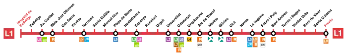 A maioria das estações, 86% delas (26 de 30), são adaptadas para pessoas com mobilidade reduzida, exceto Plaça de Sants, Espanha, Urquinaona e Clot (L1). Ao todo, são dezesseis estações com conexões para outras linhas de metrô, bonde, FGC, trens urbanos e regionais e ônibus de média e longa distância.[8][9][10]