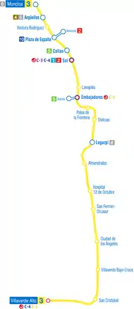 Circula entre as estações Moncloa e Villaverde Alto. O trecho entre as estações de Sol e Embajadores foi concluído em 1936, e o trecho entre Sol e Argüelles em 1941, o percurso Embajadores-Delicias oito anos mais tarde em 1949. A estação Legazpi foi aberta em 1951 e Moncloa em 1963.[3]