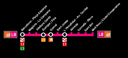 A Linha 8 do Metro de Barcelona é operada pela FGC. O leito da linha acompanha o traçado da linha férrea inaugurada em 1908, que ligava a cidade de Barcelona a Martorell. Em 1997 com a inauguração da estação Estação Magòria-La Campana, e o aumento da frequencia da chegada dos trens as estações, a linha adquiriu característica de metro urbano.[1]