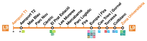 Corre entre as estações University Zone e T1 Airport. Irá partilhar um troço com a L2 de Aeroporto T1 para a estação Parc Logístic, e com a L10 no tronco comum de estação Gornal para estação Bon Pastor.