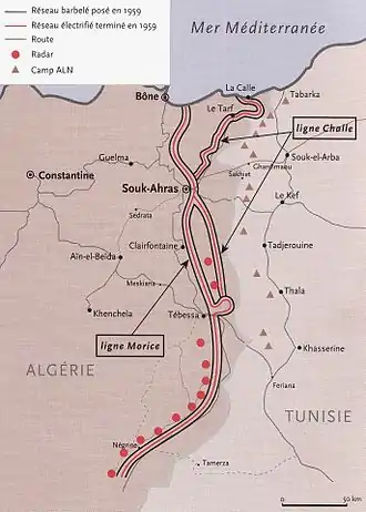 A Linha Morice estendia-se ao longo da fronteira entre a Argélia e a Tunísia (cerca de 460 km), e da fronteira entre a Argélia e Marrocos (cerca de 700 km) para reter os combatentes do Exército de Libertação Nacional da Argélia nas suas bases no exterior.