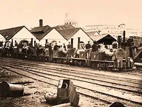 ![]() Locomotivas e cocheiras da linha em 1880. | |