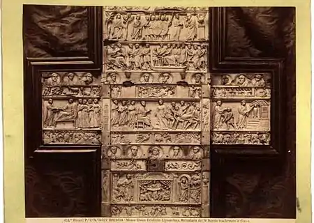 Não se sabe quando entrou na guarda do convento de São Salvador, Brescia, mas pode muito bem ter sido logo depois de ter sido fundado em 753 por Desidério, último dos Reis lombardos. Qualquer que fosse sua função original, foi usado como relicário na Idade Média, e foi referido em documentos do mosteiro como o "sepulcro de marfim", possivelmente porque continha uma pedra retirada do túmulo vazio, na Igreja do Santo Sepulcro em Jerusalém. Desempenhou um papel especial na liturgia pascal do convento, quando no início da Vigília Pascal foi aberto e os conteúdos exibidos à congregação[6].