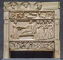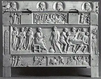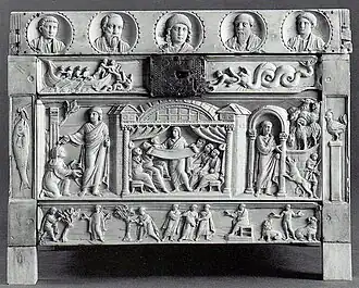 Todos os quatro lados seguem um desenho com um registro do meio contendo assuntos relativamente grandes do Novo Testamento. Acima e abaixo disso há registros mais estreitos com cenas do Antigo Testamento, e nos cantos finas imagens verticais, apenas uma contendo uma figura humana, o resto objetos simbólicos. A parte superior das faces laterais é finalizada com um registro, na verdade as laterais da tampa, de bustos de figuras masculinas em molduras redondas levemente achatadas. Faltam dois. Teria havido um total de 17 originalmente, com cinco na frente, quatro nas costas e quatro, agora faltando um, de cada lado. Um jovem Jesus sem barba é acordado para ocupar o centro do painel frontal, e ele provavelmente está cercado pelos Doze Apóstolos, com São Paulo substituindo Judas, fazendo 13. Santos Pedro e Paulo presumem-se serem os dois homens mais velhos com longas barbas flanqueando Jesus. As quatro cabeças restantes, presumivelmente as da face de trás, poderiam ser os Quatro Evangelistas, o que significaria repetição de súditos, ou outros santos. [9].
