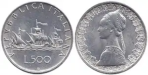 Em 1977, moedas de 200 liras feitas de alumínio-bronze foram introduzidas, seguidas, em 1982, pela moeda de 500 liras, bimetálica. Foi a primeira moeda bimetálica a ser colocada em circulação, cunhada através de um sistema patenteado pelo Istituto Poligrafico e Zecca dello Stato (IPZS). Foi também a primeira a apresentar o seu valor escrito em braille.[2]