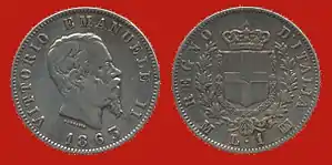 Moeda de uma lira italiana de 1863; à esquerda, o rei Vítor Manuel II, e à direita o brasão da Casa de Saboia.