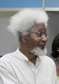 Nascido em 1934, Wole Soyinka é um dramaturgo e poeta, premiado com o Prêmio Nobel de Literatura em 1986,[65] o primeiro africano a ser homenageado nessa categoria. Soyinka nasceu em uma família Iorubás em Abeocutá. Depois de estudar na Nigéria e na Grã-Bretanha, trabalhou no Royal Court Theatre em Londres. Ele passou a escrever peças que foram produzidas nos dois países, em teatros e no rádio. Ele teve um papel ativo na história política da Nigéria e em sua campanha pela independência do domínio colonial britânico. Em 1965, ele apreendeu o estúdio do Western Nigeria Broadcasting Service e transmitiu uma demanda pelo cancelamento das eleições regionais da Nigéria Ocidental. Em 1967, durante a Guerra Civil da Nigéria, ele foi preso pelo governo federal do general Yakubu Gowon e colocado em confinamento solitário por dois anos.[66] Soyinka tem sido um forte crítico dos sucessivos governos nigerianos, especialmente dos muitos ditadores militares do país, bem como de outras tiranias políticas, incluindo o regime de Robert Mugabe no Zimbábue. Grande parte de sua escrita se preocupa com "a bota opressiva e a irrelevância da cor do pé que a usa".[67]