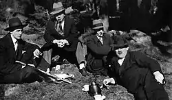 Os jovens escritores Rudolf Värnlund, Ivar Lo-Johansson e Eyvind Johnson visitam Gustav Hedenvind-Eriksson em Flysta nos arredores de Estocolmo nos finns dos anos 20
