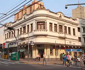 É um casarão de alvenaria de estilo eclético/déco, tendo sido construído na década de 1910 pela família Saldanha, que ali instalou uma livraria e bazar no térreo e sua residência no piso superior. A entrada principal é na esquina, cujo acesso se dá por pequeno lance de degraus. Há outras entradas laterais e uma série de janelões que servem como vitrines. A entrada para a residência era independente, e se abria para a rua Visconde de Pelotas. Este pavimento tem decoração escassa, e os adornos se concentram no nível acima.[1]