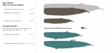 ![]() Reconstituição artísticas de cetáceos fósseis: Livyatan à esquerda. Cetotherium, à direita. | |||||||||||||||||