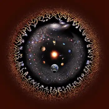 | Universo observável | 28.500 Mpc | 8.79×1023 | 23.94 | Pelo menos 2 trilhões de galáxias no universo observável, dispostas em milhões de superaglomerados, filamentos galácticos e vazios, criando uma superestrutura semelhante a uma espuma. | [50][51][52][53] |
