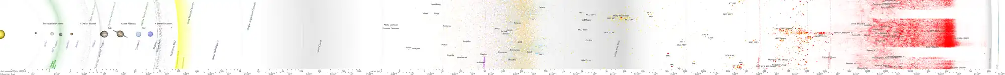 ![]() Representação logarítmica do universo centrado no Sistema Solar. Os corpos celestes neste gráfico são mostrados com seus tamanhos ampliados. |