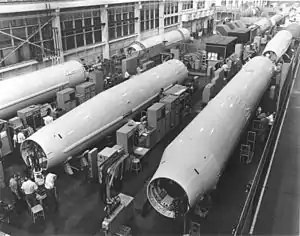 Linha de montagem, onde se vê um Thor original a esquerda, e um Long Tank Thor a direita.