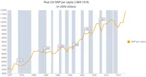 Nos Estados Unidos, o National Bureau of Economic Analysis data a recessão em março de 1879. Em janeiro de 1879, os Estados Unidos voltaram ao padrão ouro que haviam abandonado durante a Guerra Civil; de acordo com o economista Rendigs Fels, o padrão-ouro estabeleceu um piso para a deflação, e isso foi ainda impulsionado por uma produção agrícola especialmente boa em 1879.[39] Na verdade, de 1869 a 1879, a economia dos Estados Unidos cresceu a uma taxa de 6,8% para o produto nacional líquido real (NNP) e de 4,5% para o NNP real per capita.[40] Os salários reais permaneceram estáveis de 1869 a 1879, enquanto de 1879 a 1896, os salários nominais aumentaram 23% e os preços caíram 4,2%.[41]