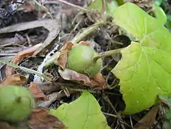 As folhas são ovato-cordadas, muito flexíveis e suaves, com 6–8 cm de comprimento e 5–7 cm de largura, apresentando margens com 1 ou 2 lobos em cada lado da inserção do pecíolo e 18-20 pequenas indentações em cada lado. Os pecíolos têm 4,5–6 cm de comprimento, frequentemente modificados para formarem gavinhas retorcidas. As faces superior e inferior das folhas são densamente revestidas por pêlos simples de cor verde pálido. Enervações laterais fracamente desenvolvidas.[2]