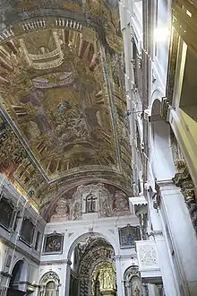 Neste teto optou por uma espacialidade próxima dos italianos e das teorias de Andrea Pozzo, desenvolvendo uma cena que representa a Assunção da Virgem. No ponto central da obra, onde se localiza o grupo de figuras que compõem o essencial da narrativa, "o artista desenvolve uma ciência de escorço em perspetiva ascendente, como se uma linha perpendicular à nave fosse estirada de baixo para cima da igreja, num esforço de romper a frontalidade em favor de uma crescente aproximação dos espaços luminosos e infindos", oferecendo assim, aos peregrinos, uma "imagem de deslumbrância e de céu aberto na terra [...] logo desde a entrada do templo".[2]