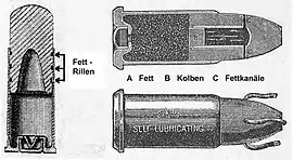 Aqui, a bala contém um cilindro cheio de graxa em um orifício na parte traseira. Quando o tiro é disparado, a pressão dos gases de combustão empurra a graxa para a frente por meio de um pistão e a pressiona, através de canais na bala, para o interior do cano.[5]