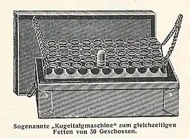 No início de 1900, Gerhard Bock, um atirador de pistola esportiva de Charlottenburg, descreveu uma "máquina" com a qual balas de chumbo em 50 pequenas tigelas podem ser mergulhadas em sebo líquido no livro de bolso "Moderne Faustfeuerwaffen und ihr Gebrauch" (algo como "Armas de mão modernas e seu uso"), publicado por ele. As pequenas tigelas fechadas no fundo garantiam que a base das balas permanecesse livre de sebo depois que ele se solidificasse. [4]