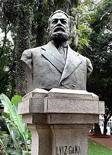 | “ | A herma de Luiz Gama constitui-se, segundo pena do próprio escultor, de um busto do homenageado em atitude de tribuno, colocado sobre um pedestal de granito executado em caráter moderno. O bronze é imponente, medindo 1,10 metro e apresentando um retrato do abolicionista em postura solene, lançando o olhar ao horizonte. Gama é retratado vestindo uma pesada casaca transpassada, elegantemente adornada por uma gravata em laço que lhe envolve o pescoço. A barba e o cabelo aparecem cuidadosamente aparados, crescidos apenas o suficiente para que se perceba a natureza lanosa de sua textura, ricamente trabalhada pelo cinzel do artista. Seus traços são finamente tratados, à maneira da escola verista italiana, de forma a evidenciar o apuro técnico do escultor, mas não dar margem a muito mais do que isso. A busca da semelhança com o retratado regia a prática escultórica nesse período e era tudo o mais que se esperava do autor de uma herma. Uma peça bastante significativa, porém, na sua aparente simplicidade. | ” |