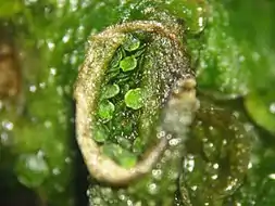 Sobre a superfície do talo estão por vezes presente pequenas formações cónicas encimadas por um estoma de maiores dimensões que os restantes, por vezes circundado por células translucentes armazenadoras de lípidos. São frequentes pequenas estruturas ténues e mais brilhantes onde existe maior acumulação de matéria oleosa no tecido da epiderme.