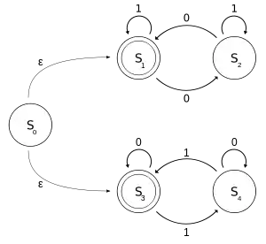 - Exemplo 1: O seguinte exemplo explica um AFND M, com um alfabeto binário, que determina se uma entrada contém um número par de 0s ou um número par de 1s (Note que 0 ocorrências é um número par de ocorrências). Seja M= (Q, Σ, T, s0, F) onde