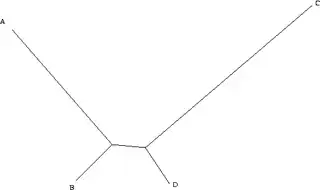 Um exemplo de atração de ramificações longas. Se os ramos A e C tiverem um número alto de substituições na "árvore verdadeira" (presumida, nunca realmente conhecida, exceto em simulações), a parcimônia poderá interpretar mudanças paralelas como sinapomorfias e agrupar A e C juntos.