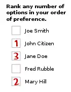 Uma maneira típica para que os eleitores especifiquem suas preferências em uma cédula eleitoral (veja a esquerda) é através do seguinte; cada cédula lista todos os candidatos, e cada eleitor ordena sua lista na ordem de sua preferência através de números: o eleitor preenche '1' ao lado do(s) candidato(s) que mais prefere, um '2' ao lado do(s) segundo(s) mais preferidos, e assim sucessivamente. Cada eleitor pode opcionalmente