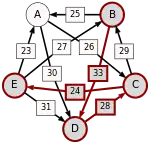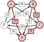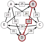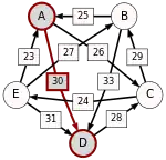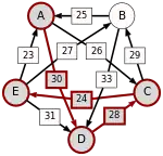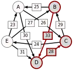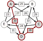 Lembre que força de um trajeto é a força de sua ligação mais fraca. Um exemplo de calcular o trajeto mais forte é p[B, D] = 33: o trajeto mais forte de B a D é o trajeto direto (B, D) que possui força 33. Para contraste, vamos também calcular p[A, C]. O trajeto mais forte de A a C não é o trajeto direto (A, C) de força 26, mas o trajeto mais forte é o trajeto indireto (A, D, C) que possui força min(30, 28) = 28.