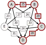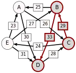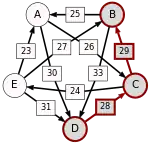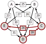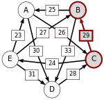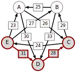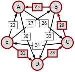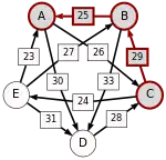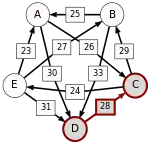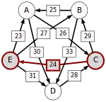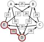 Para ajudar a visualizar os trajetos mais fortes, o diagrama no lado direito mostra uma seta de A a B com rótulo d[A, B], no estilo de um gráfico orientado. (Para evitar tumultuar o diagrama nós só desenhados d[A, B] quando d[A, B] representa a maioria dos eleitores, o que parece não afetar o resultado neste caso.)