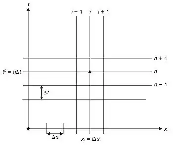 A fim de aplicar um método de diferenças finitas, discretizamos os domínios do tempo e espaço, com passos constantes. Ou seja, o eixo x é discretizado em N intervalos de malha , e o eixo y em intervalos de tempos constantes , como mostrado na figura ao lado, com: