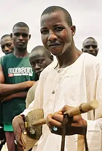 Tocar diversos sinos é uma característica comum de festas reais, e foram utilizadas em sociedades secretas. Estes são normalmente feitos de ferro ou, nas orquestras islâmicas do norte, de bronze. As cabaças golpeadas com paus, colocadas sobre um pano, são características da música feita por mulheres, bem como as danças do culto bòòríí.