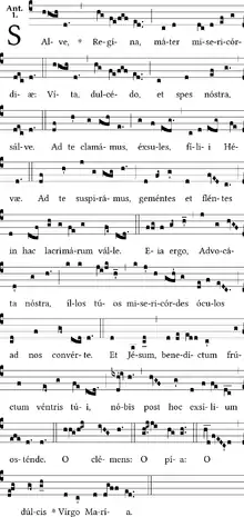 Uma das primeiras composições marianas medievais, diz um autor, é a Salve Regina, possivelmente de um monge beneditino da Ilha de Reichenau, que existe em várias versões gregorianas. A Liturgia das Horas inclui vários ofícios a serem cantados. No encerramento do Ofício, uma das quatro antífonas marianas é cantada. Estas canções, Alma Redemptoris Mater, Ave Regina Caelorum, Regina caeli, e Salve Regina, têm sido descritas como "entre as mais belas criações do final da Idade Média".[22]