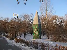 O último estágio de um míssil SS-17 Spanker num museu ao ar livre na Rússia