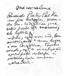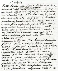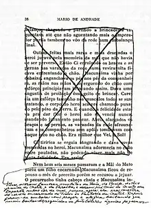 - "No geral meus atos e trabalhos são muito conscientes por demais para serem artísticos. Macunaíma não. Resolvi escrever porque fiquei desesperado de comoção lírica quando lendo o Koch-Grünberg percebi que Macunaíma era um herói sem nenhum caráter nem moral nem psicológico, achei isso enormemente comovente nem sei porquê, de certo modo pelo ineditismo do fato, ou por ele concordar um bocado com a nossa época, não sei..." [35]