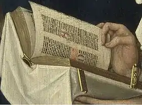 - Santa Bárbara representada na zona direita do Retábulo de Werl, 1438, Museu do Prado, Madrid. Campin foi mestre de van der Weyden e influenciou significativamente o seu trabalho. Note-se, tal como com a imagem de van der Weyden, o único movimento visível é o virar da página.