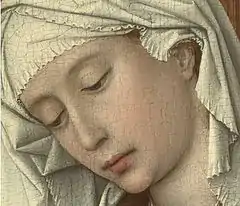 Muitos dos objectos em seu redor também apresentam um detalhe assinalável, em particular o chão de madeira e os pregos, as dobras do vestido de Maria, as vestes das figuras no exterior e as contas de José.[6][10] O efeito da luz cadente também foi cuidadosamente estudado; as contas de cristal do rosário de José são brilhantes, enquanto se podem observar traços subtis de luz e sombra no desenho do aparador e nos grampos do seu livro. Maria está concentrada na leitura e, aparentemente, distraída do que a rodeia. Van der Weyden representou-a com uma dignidade muito serena e pouco habitual nas suas obras, já que geralmente ele é visto como o mais emocional dos mestres holandeses da sua época, em particular quando comparado com Jan van Eyck.[10]